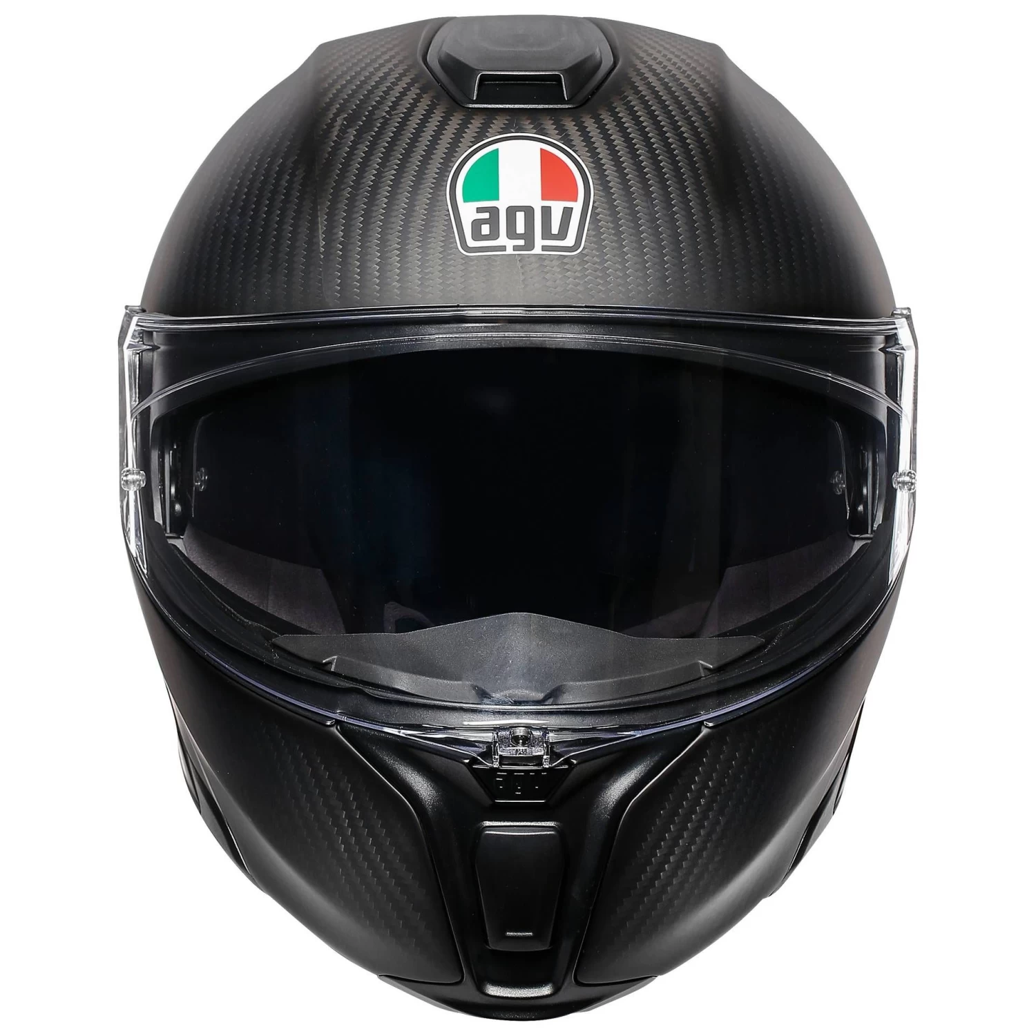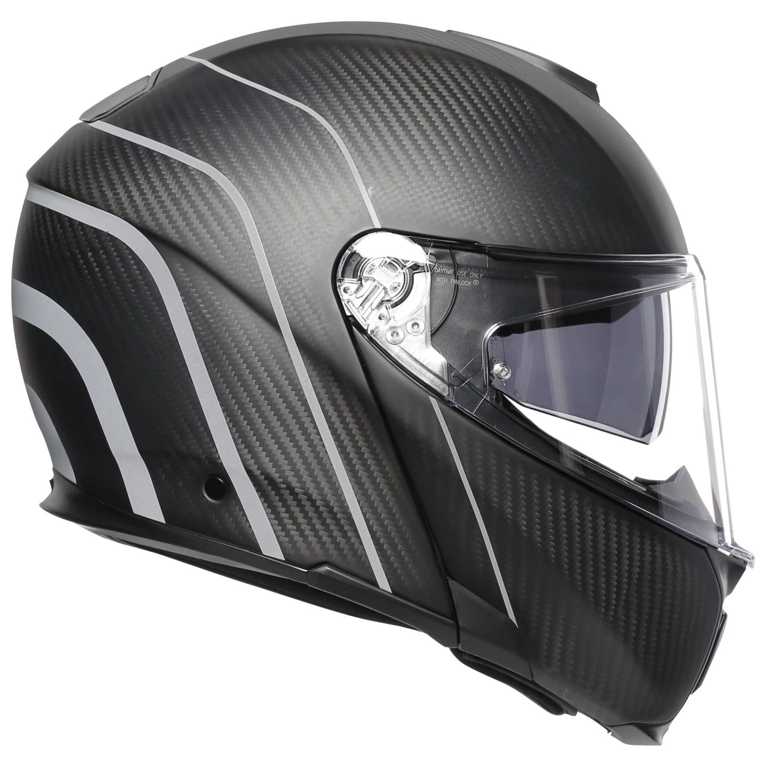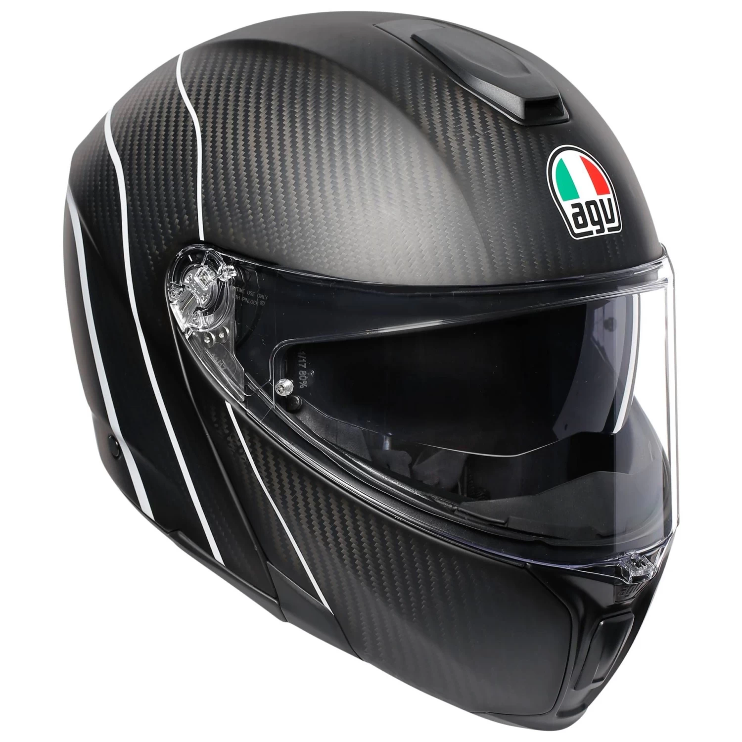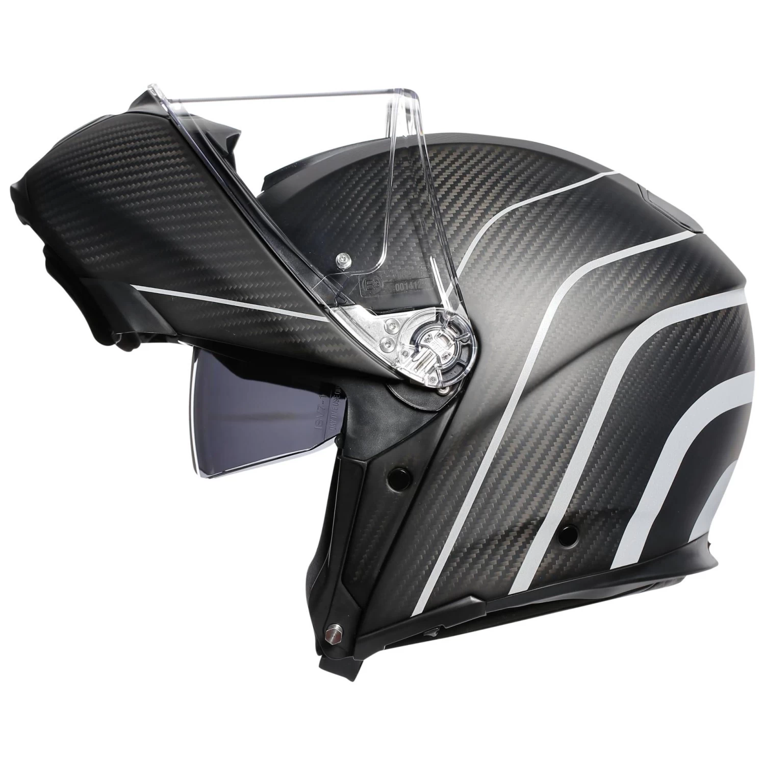 The world’s first SportModular helmet: the performance of a full face helmet together with the comfort of a modular. Entirely built in Carbon Fiber (shell and chin), this specific structure achieves the same protection performance of MotoGP’s Pista GP R in an incredibly light weight construction, combing the highest levels of comfort and safety. Designed to offer 190° horizontal view as the human eye capability, SportModular has been conceived in the wind tunnel for superior quietness, aero stability and ventilation.