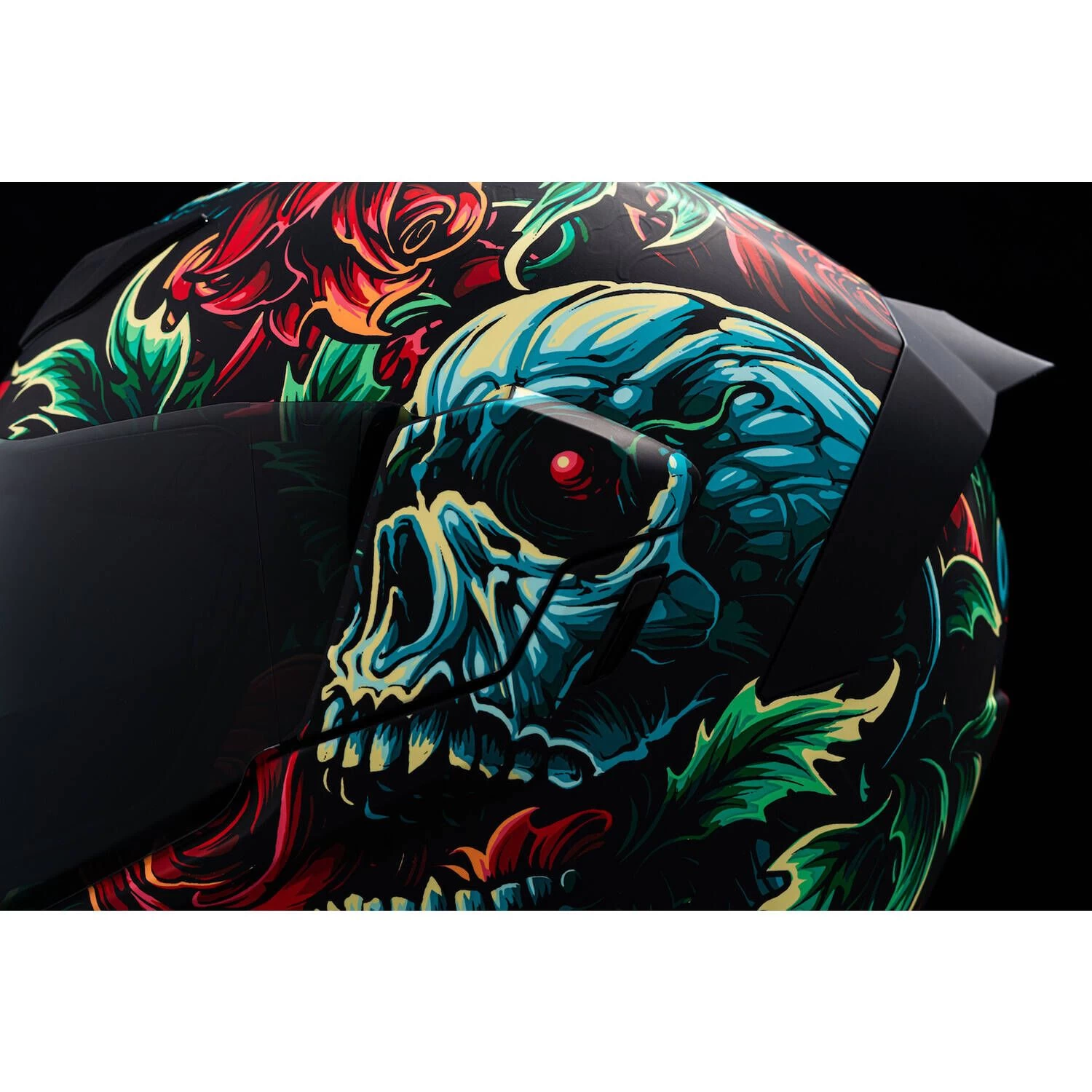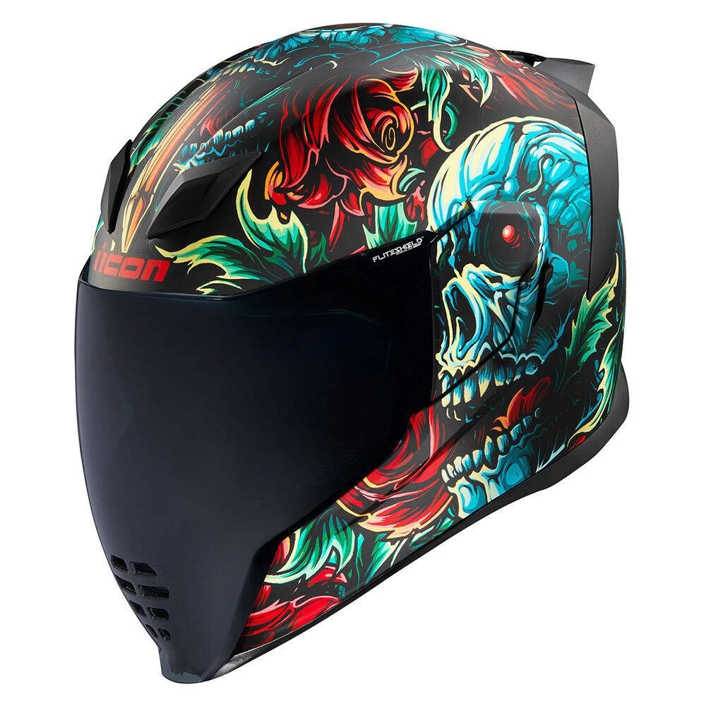 Roses are red, this skull is pale blue, beware of the sword that pierces it through. Equipped with a dark smoke Fliteshieldâ„¢ and slathered from tip to tail in Icon’s exclusive matte Rubatone finish, the Airflite Omnicruxâ„¢ is gothic incarnate. If the exterior wasn’t dark enough, the Omnicruxâ„¢ features an internal dark-smoke Dropshieldâ„¢ to double down on your eternal night. The Airflite MIPS Omnicruxâ„¢ also ensures compliance with ECE 22-06. In addition, the removable Hydradryâ„¢ liner wicks excess sweat away from your fevered brow, while the dual safety standards ensure almost global compatibility.
