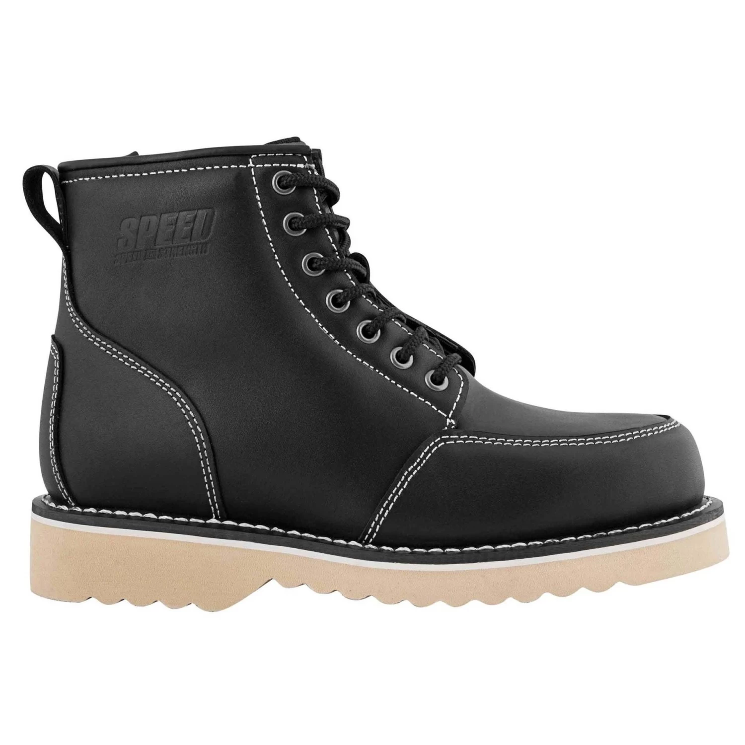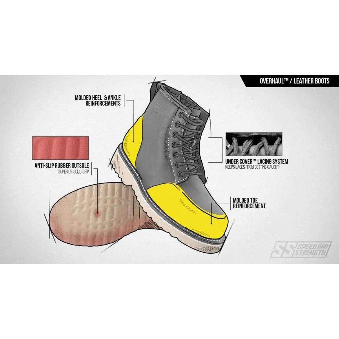 The Overhaulâ„¢ leather motorcycle boots from Speed and Strength feature a premium leather upper upper and offer a wide comfort fit with a side zip entry. The boots are built with molded toe, heel and ankle reinforcements and are equipped with an anti-slip rubber outsole for maximum grip.