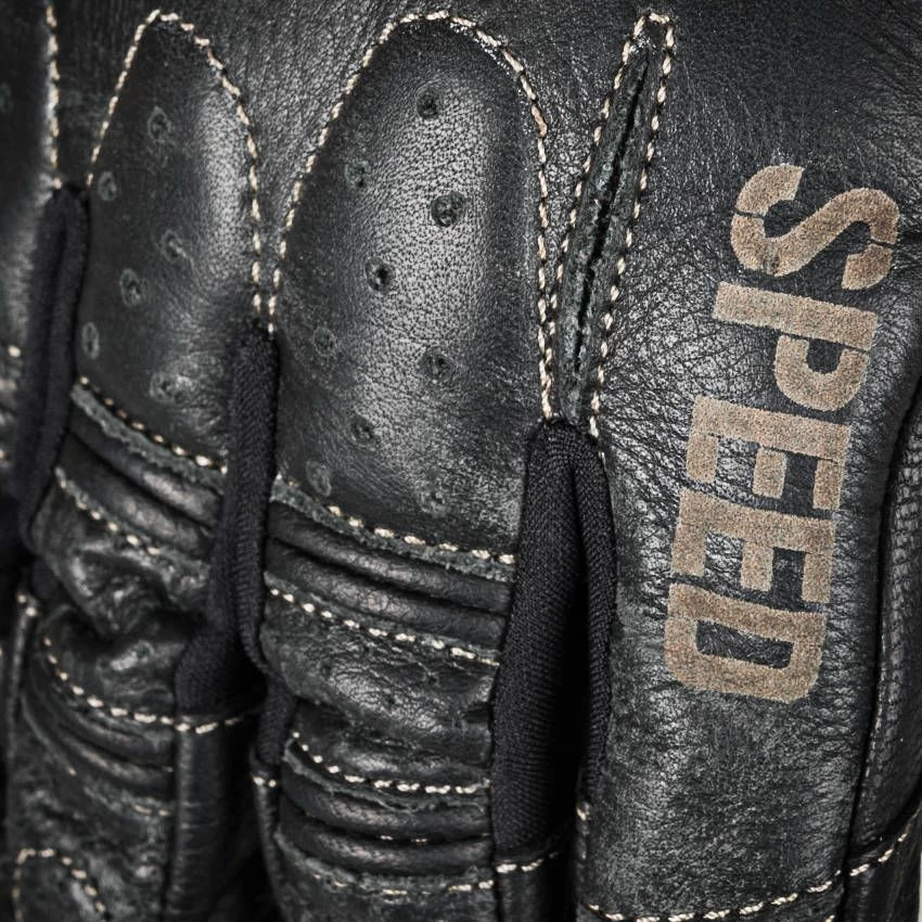 The Speed and Strength®Rust and Redemption™ pre-curved race cut fit leather motorcycle gloves feature a leather frame and a reinforced leather palm for abrasion resistance and slide protection. The gloves come with hinged knuckles and a hook and loop wrist closure for an adjustable secure fit.