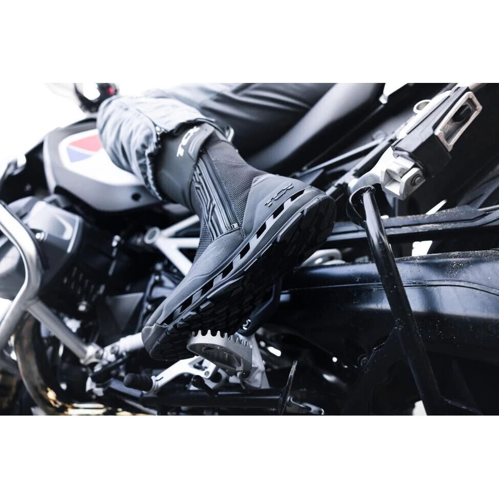 The Clima 2 Gore-Tex Surround® touring boots are protective, waterproof and suitable for all weather conditions. Boasting the perfect balance between fabric and reinforced areas, these boots are both lightweight and comfortable while guaranteeing maximum safety in those areas most exposed to impact and abrasion. Their Gore-Tex Surround® technology, with internal ventilation grille and side vent perforation, channels moisture and heat outward. The exclusive sole construction operates in synergy with the breathable and wear-resistant upper and with the Gore-Tex® Extended Comfort membrane, to ensure all-round comfort in every climate. The reinforced polyurethane inserts on shin and ankle, as well as the polyurethane lever guard, ensure maximum safety. The Groundtrax® sole features a rubber tread with an anti-slip design for maximum grip on all surfaces and is accompanied by a polyurethane midsole providing structural rigidity, comfort and long-lasting cushioning.