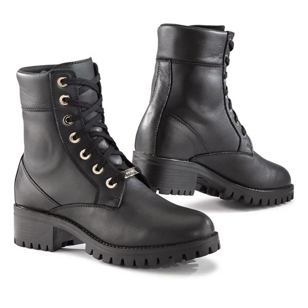 The TCX X-Lady Smoke Waterproof boots have been designed to fit the anatomy of the female foot perfectly, which we are told is built a little differently to male foots. This provides ultimate comfort for long rides and the casual urban feel of these boots makes them look just as cool off the bike as on it. Made from full grain soft leather and featuring a soft touch waterproof membrane lining, malleolus inserts, reinforced heel and toe counter, lacing closure system, rubber sole, 3cm heel and CE approved.